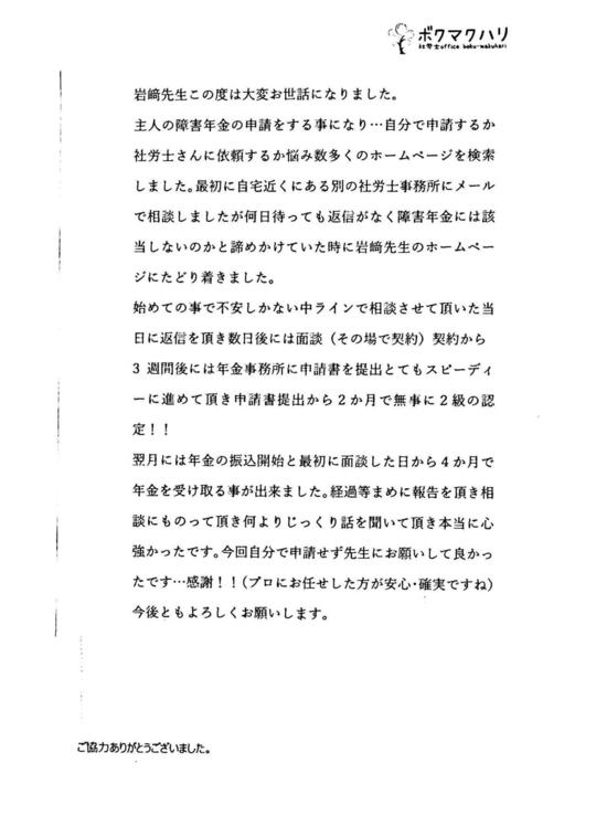 始めての事で不安しかない中ラインで相談させて頂いた当日に返信を頂き数日後には面談(その場で契約) 契約から3週間後には年金事務所に申請書を提出とてもスピーディ 一に進めて頂き申請書提出から2か月で無事に2級の認定!!