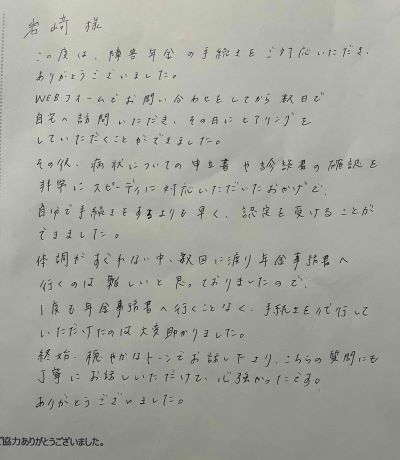 この度は、障害年金の手続きをご対応いただきありがとうございました。