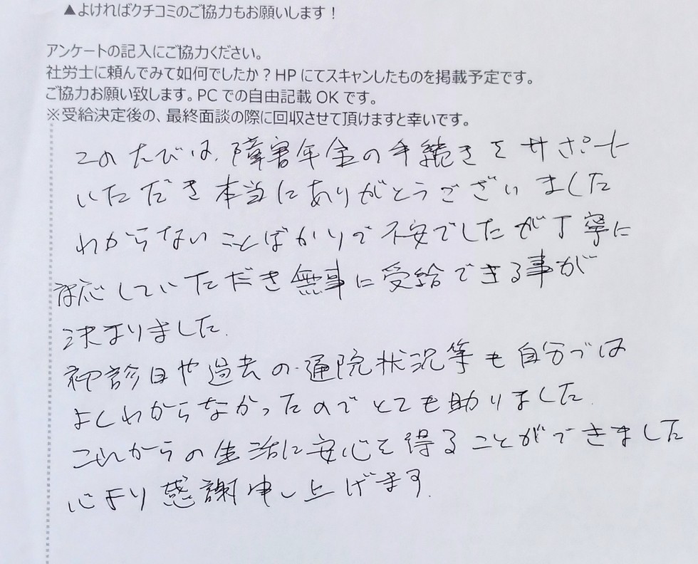 ただ、お客様に細かくヒアリングをすることで、傷病の波をとらえることができ、病歴・就労状況等申立書に適切に落とし込むことが出来きたことで、5年遡及として認定されたと思っています。