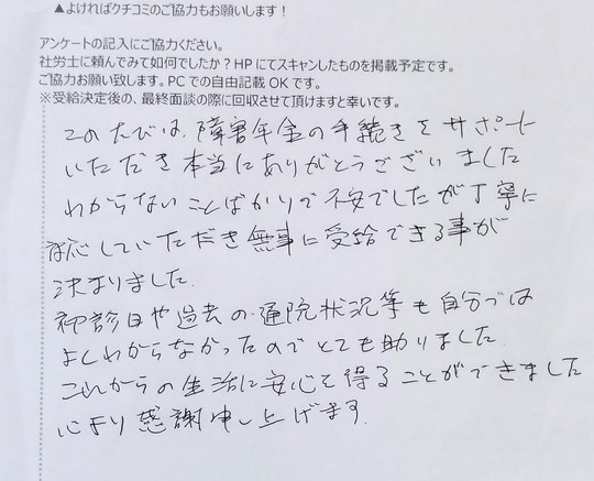 このたびは、障害年金の手続きをサポートいただき本当にありがとうございました。