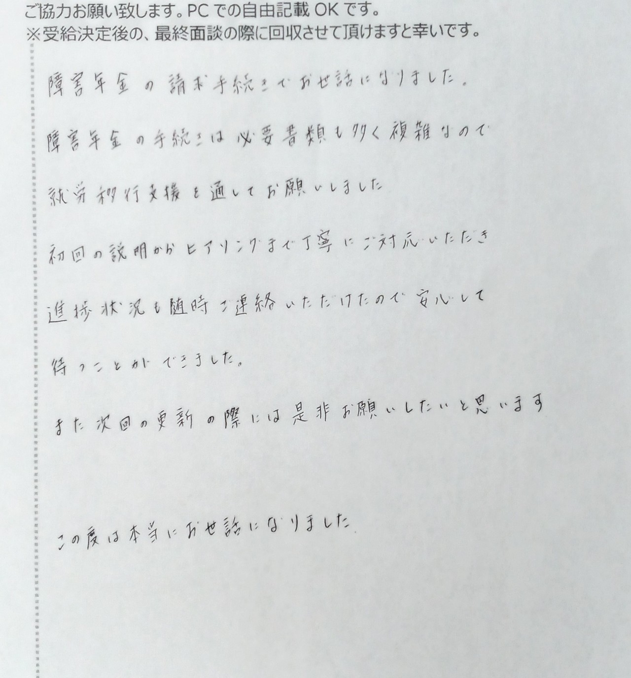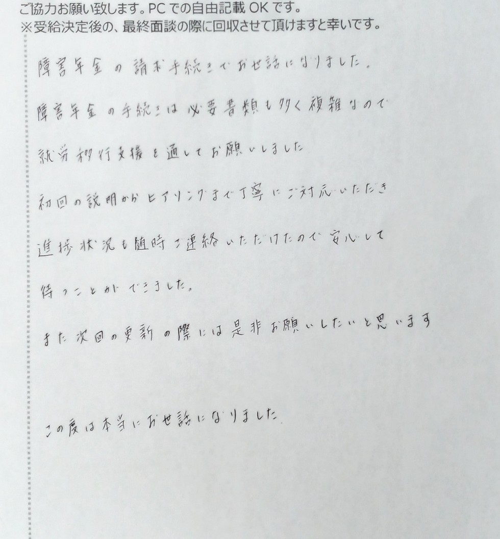 連携先からのご紹介でお話しさせて頂きました。お身体の関係でお薬の処方がなく、医証や記録も含めて日本年金機構に申し立てましたが、3級の決定となりました。就職も決定され新しい生活に入られるとのこと。年金が少しでも安心材料になればと思います。