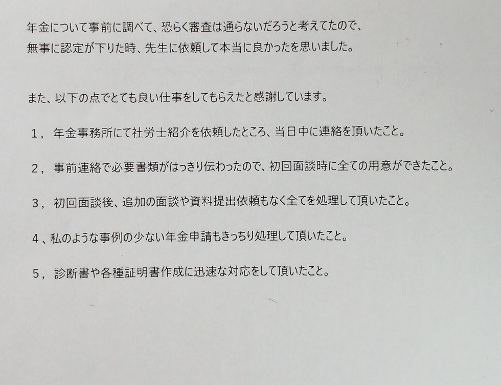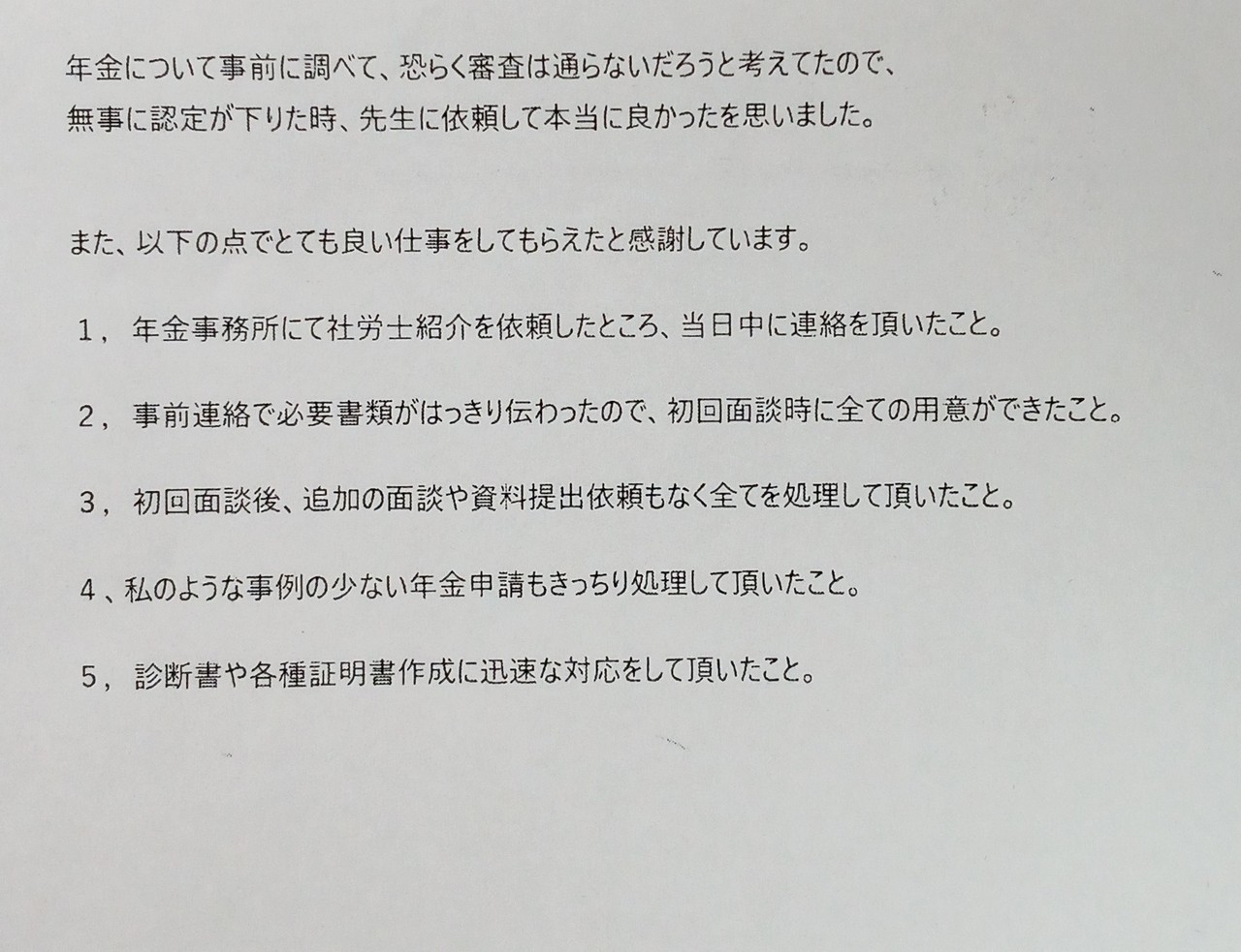 初診日が共済組合の方でした。葛飾支部長よりご連絡頂き受任することになりました。認定まで半年ほどかかりましたが、無事5年遡及。永久認定を頂くことが出来ました。精神での永久認定は初めてでしたが、これで更新の心配なくゆっくり着実に歩みを進めることができることと存じます。最終面談の際にも晴れやかなお顔を拝見することが出来ました。今後も見守っていきたいと思いました。