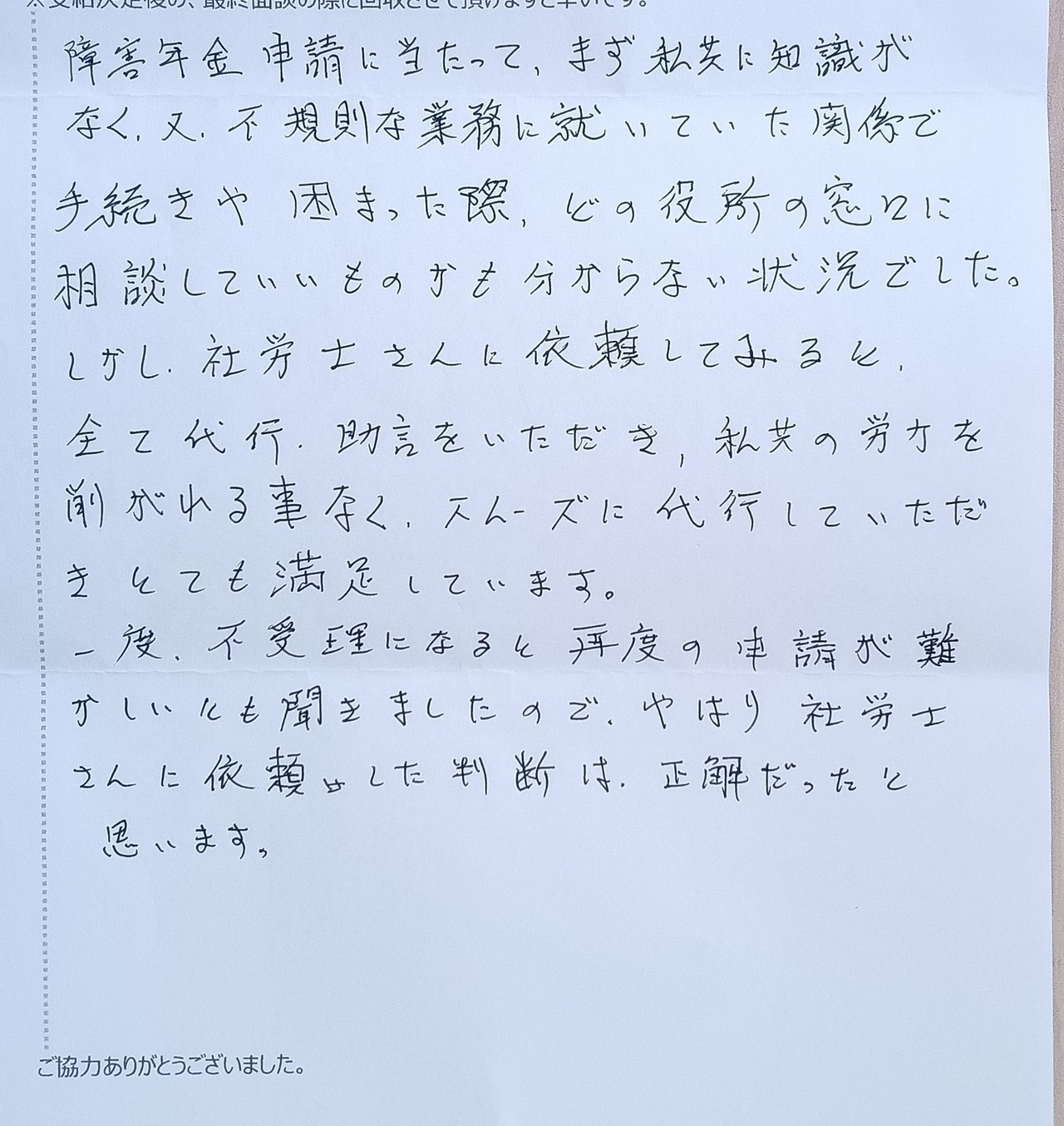 障害年金は、一度不支給となると再度の請求に大きな労力が必要となるケースもあります。だからこそ、初回から可能な限り適切な準備と手続きが重要です。今回、その点を評価していただき光栄に存じます。今後もご不明点やご不安な点がございましたら、どうぞお気軽にご相談ください。