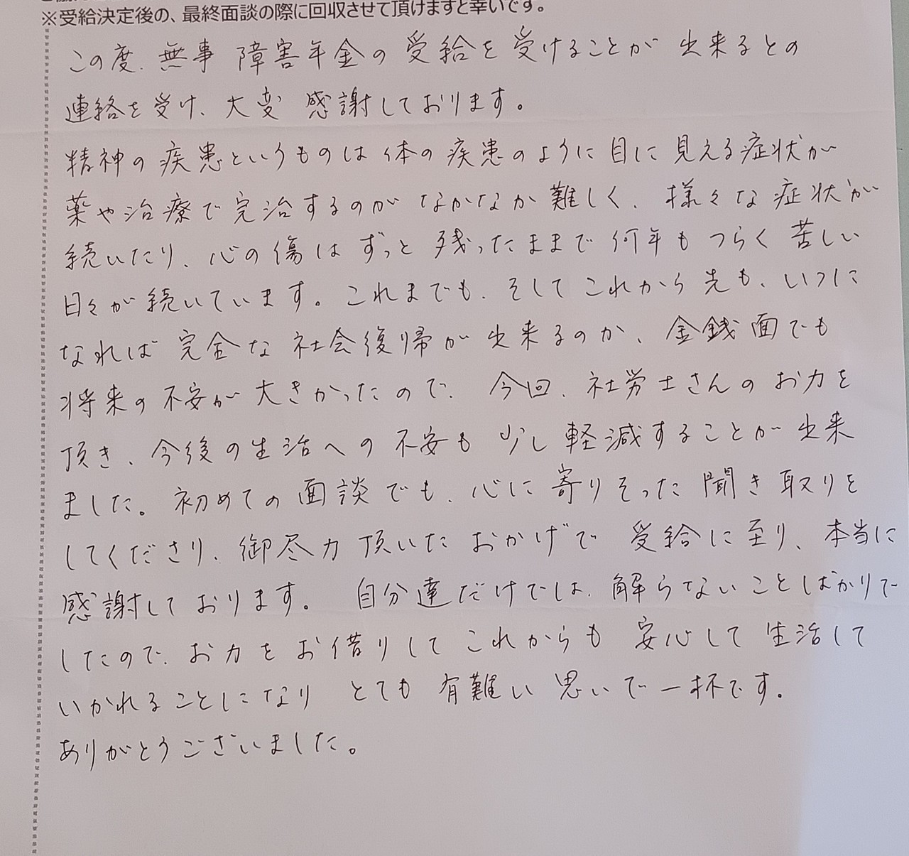 このたびは、丁寧で率直なお気持ちをお寄せくださり、ありがとうございます。無事に受給のご連絡に至ったとのこと、私自身も安堵の気持ちでおります。