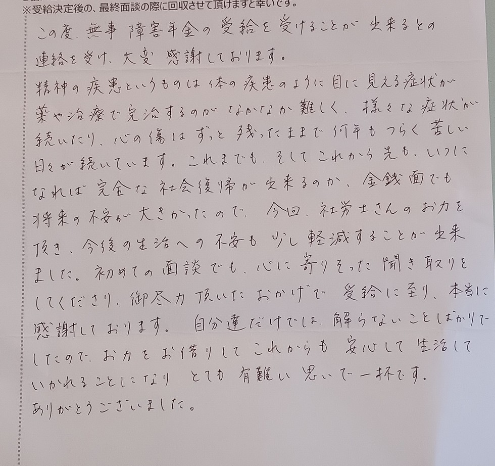 この度、無事障害年金の受給を受けることが出来るとの連絡を受け、大変感謝しております。