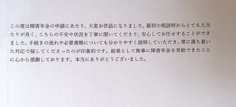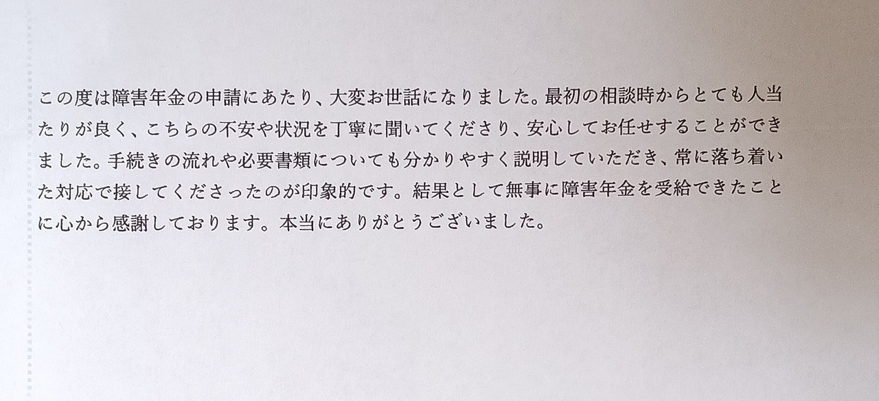障害年金の手続きは分かりづらい点も多く、先が見えにくいものです。だからこそ、できるだけ丁寧に、わかりやすく、落ち着いて進めることを心がけております。その姿勢を感じ取っていただけたことは、何よりの励みです。
