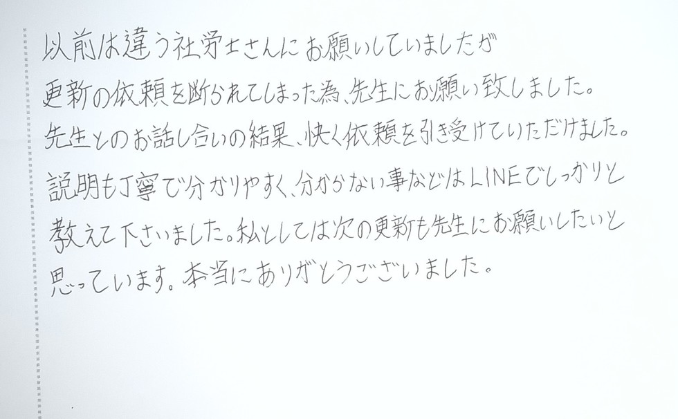 更新を断られるというご経験の後でのご相談は、きっとご不安も大きかったことと思います。そのような状況の中でお声がけいただけたことを、心より感謝しております。